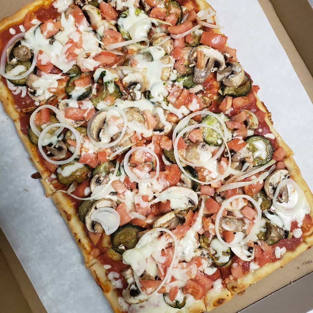 Thin Sicilian topped with fresh mushrooms, fresh tomatoes, zucchini, onions, and cheese.