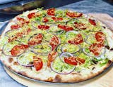 Topped with fresh tomatoes, basil, garlic, and mozzarella cheese.