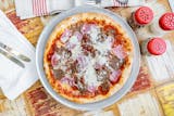 Cheese pizza with sausage, pepperoni, meatballs, ham, and bacon.