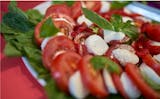 Slices tomatoes, fresh mozzarella, and balsamic drizzle.