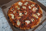 Thin Sicilian-like crust, topped with shredded mozzarella, a drizzle of our special garlic blend, and finished with strips of our fresh basil flakes.