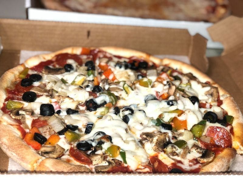 Pronounced (fa-ged-a-bout-it)…Our traditional pie topped with pepperoni, sausage, onions, mushrooms, green peppers, black olives & extra cheese.