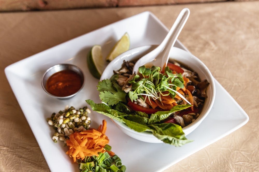 Yellow curry with kaffir lime, lemongrass, ginger, carrots, snap peas, napa cabbage, mung bean sprouts, and medicinal mushrooms. Served with basmati rice or mung bean noodle. (Vegan, gluten-free)
