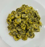 served with Pesto sauce, topped with parmesan cheese and comes with garlic bread.