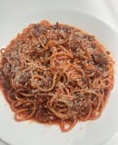 served with Homemade Bolognese sauce, topped with parmesan cheese and comes with garlic bread.