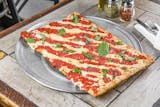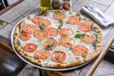 Old fashioned thin crust, homemade fresh mozzarella cheese, fresh tomato, basil, olive oil and grated cheese.