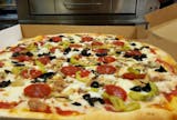Topped with mushrooms, pepperoni, onions, black olives, sausage & peppers.
