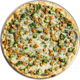 Vegan chicken, daiya cheese, broccoli, and garlic with a basil pesto base.