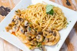 Pancetta, mushrooms, green peas with cream sauce.