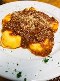 Vegan. Cheese ravioli with homemade tomato sauce and mozzarella.