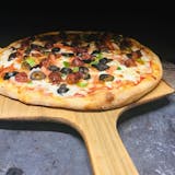 Vegan sausage, caramelized onion, green peppers, melted daya vegan mozzarella, homemade marinara sauce & vegan parmigiana cheese.