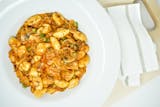 Diced shrimp & asparagus over lobster ravioli in a creamy pink sauce.