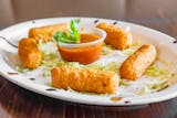 Strips of breaded chicken topped with tomato sauce and mozzarella.