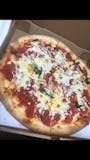 Thin crust, pan pizza with Pomodoro tomatoes, basil, homemade mozzarella, olive oil & fresh garlic.