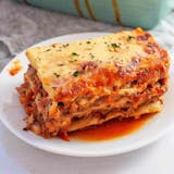 Stacked layers of pasta packed with meat and cheese, covered in red sauce. Pro tip: Go for the crispy edge pieces.