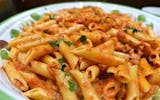 Penne with onions, pancetta, vodka, with a pink marinara sauce.