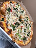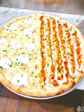 Choose your favorite beef or pork pepperoni fresh mozzarella cheese homemade pizza sauce and pesto sauce.