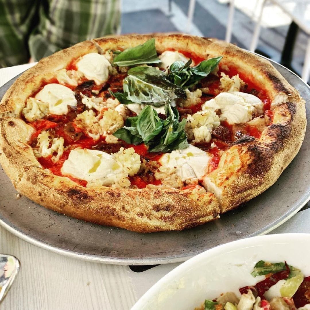 Soy free. Tomato marinara, cauliflower, cashew mozzarella, sitake bacon, basil.