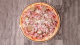 14" Pizza on a gluten-free crust. Topped with homemade tomato sauce, pepperoni, sausage, bacon, ham, and imported finest grande mozzarella.