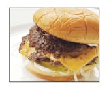 Double freshly made smash burger with fried onions pickles and house sauce on a toasted potato bun