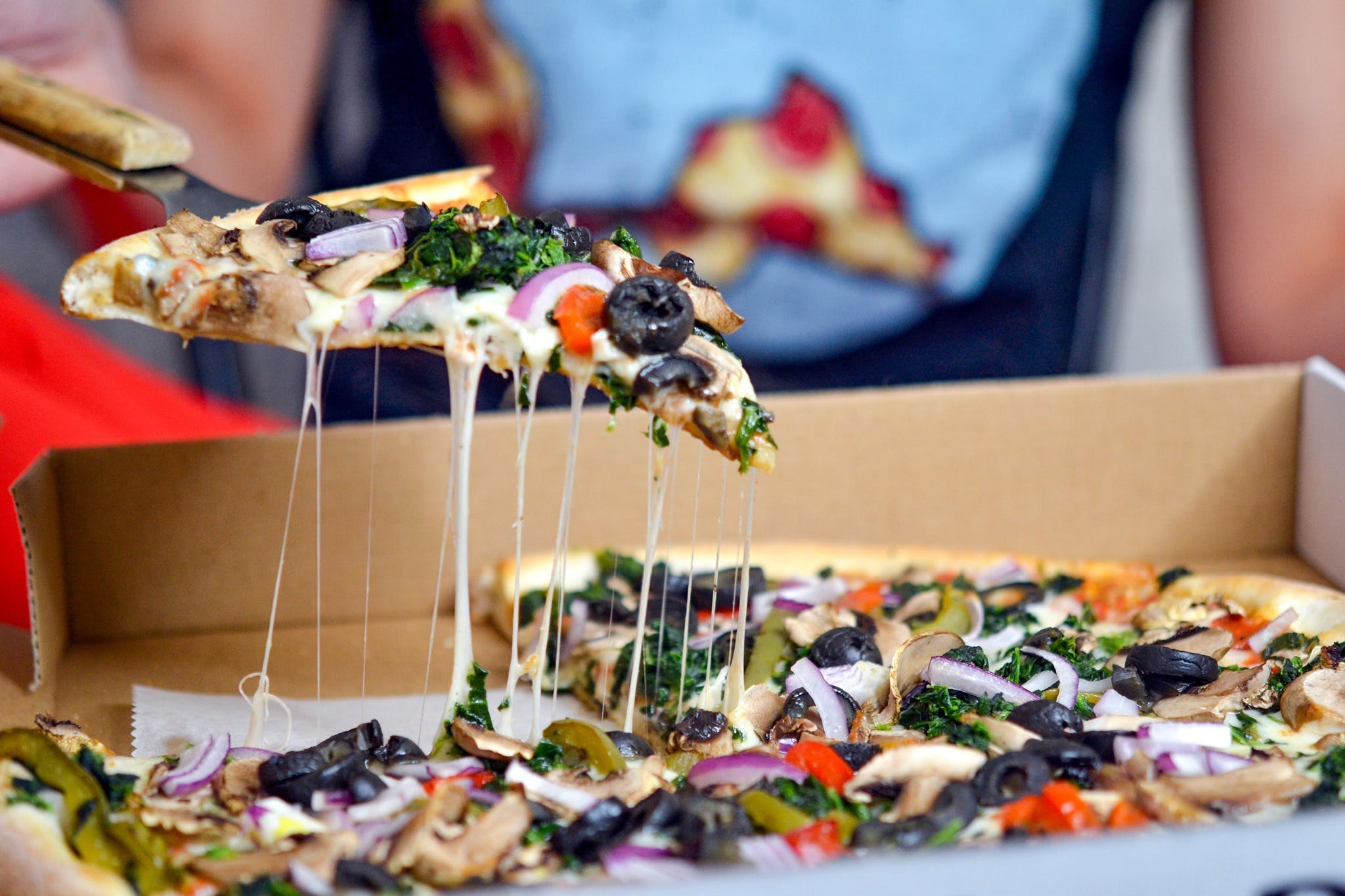 Spinach, fresh mushrooms, olives, peppers, onions, mozzarella and tomato sauce.