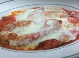 Topped with eggplant and mozzarella in a brown marinara sauce.