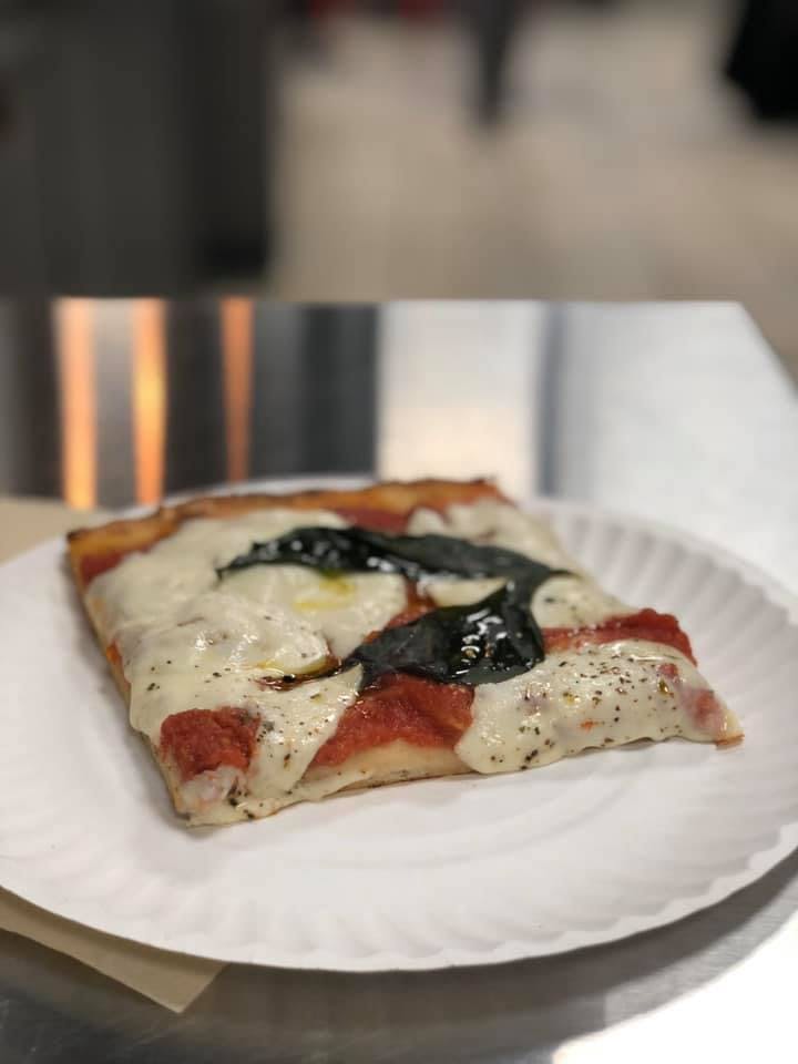 Grandma sauce with fresh basil, extra virgin olive oil and homemade fresh mozzarella cheese.