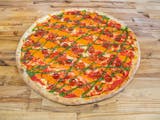 Fresh zucchini, yellow pepper, red pepper, slivered garlic, Oregano, creamy mozzarella cheese, aged mozzarella, and tangy tomato sauce.