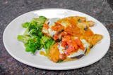 Breaded eggplant topped with mozzarella cheese & tomato sauce.