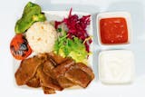 Homemade seitan gyro seasoned with herbs. Plates served over rice with salad, pita bread, hot sauce and our special white sauce.. Add sauces for an additional charge.