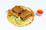 Handmade Feta Cheese Pastry Rolls (5 pcs) Crispy, golden, and freshly rolled by hand—these savory pastries are filled with creamy feta-style curd cheese and wrapped in delicate layers of thin, flaky phyllo dough. Baked to perfection, each roll delivers a satisfying crunch and rich, cheesy flavor in every bite.Contains: Wheat, Milk