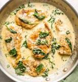 Pan seared covered with sauteed spinach & mozzarella cheese in a roasted garlic cream sauce.