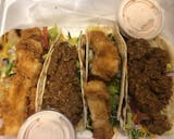 10 toasted flour tortilla's filled with shredded lettuce, fancy cheddar cheese, diced tomatoes, golden fried beer-battered codfish with sriracha lime cream sauce and served with chips and salsa with brownies.