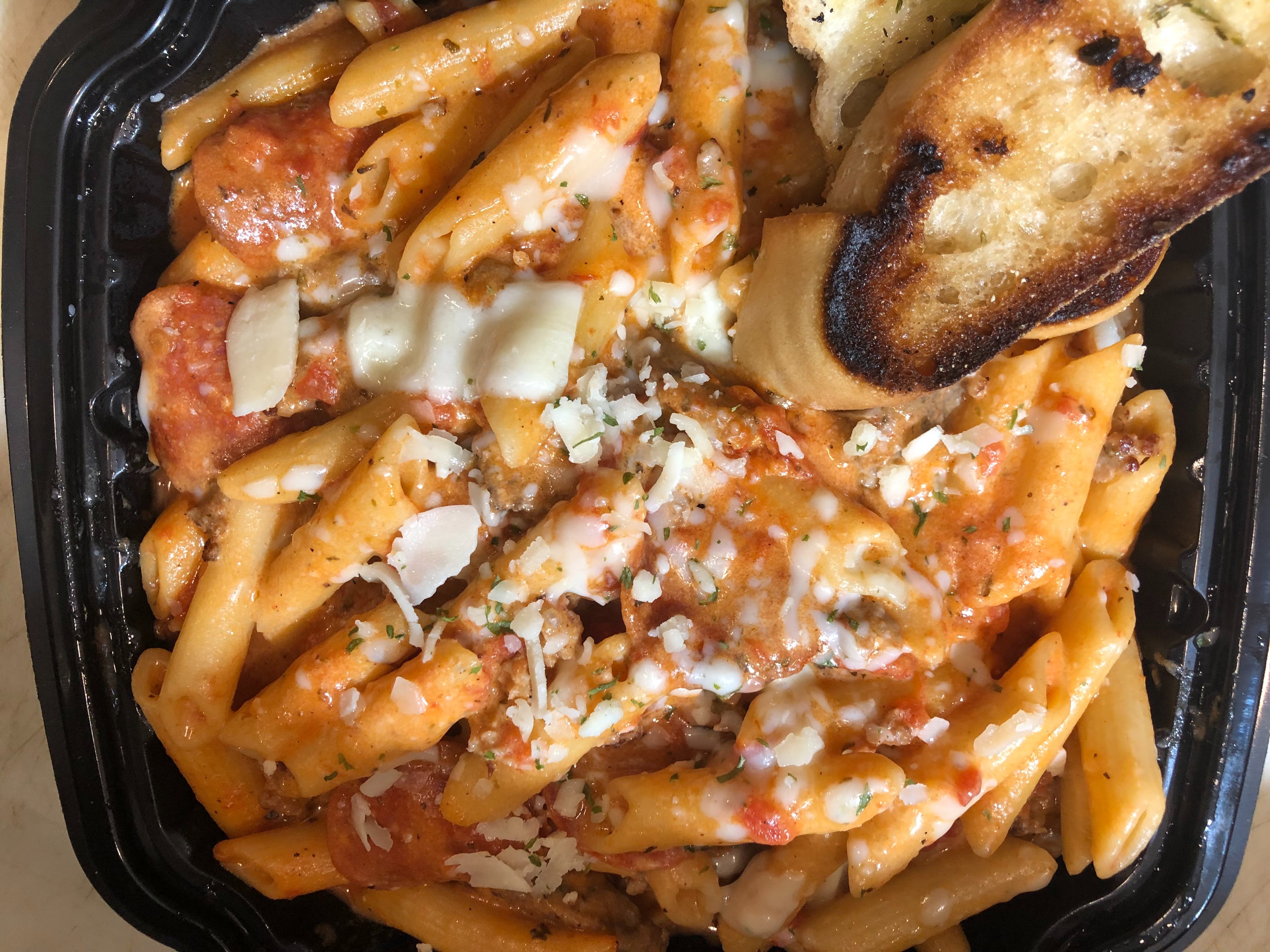 Thin cutlets, fries and finished with marinara and mozzarella cheese and served over penne pasta with garlic bread and brownies.