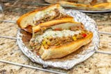 Steak or chicken hoagie over pasta with seasoned dressing cheese.