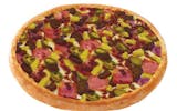 Pepperoni, ham, bacon, onions, green peppers and mushrooms.