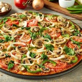 Cauliflower crust topped with red sauce, smoked provolone, romano, freshly cut green peppers and onions, mushrooms and plant-based sausage.