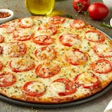 Fresh mozzarella and Asiago, smoked Provolone, freshly cut Roma tomatoes, basil, olive oil (instead of red sauce).