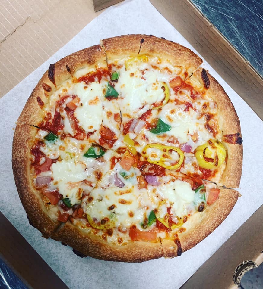 Pepperoni, sausage, mushrooms, green peppers, red onions, and banana peppers