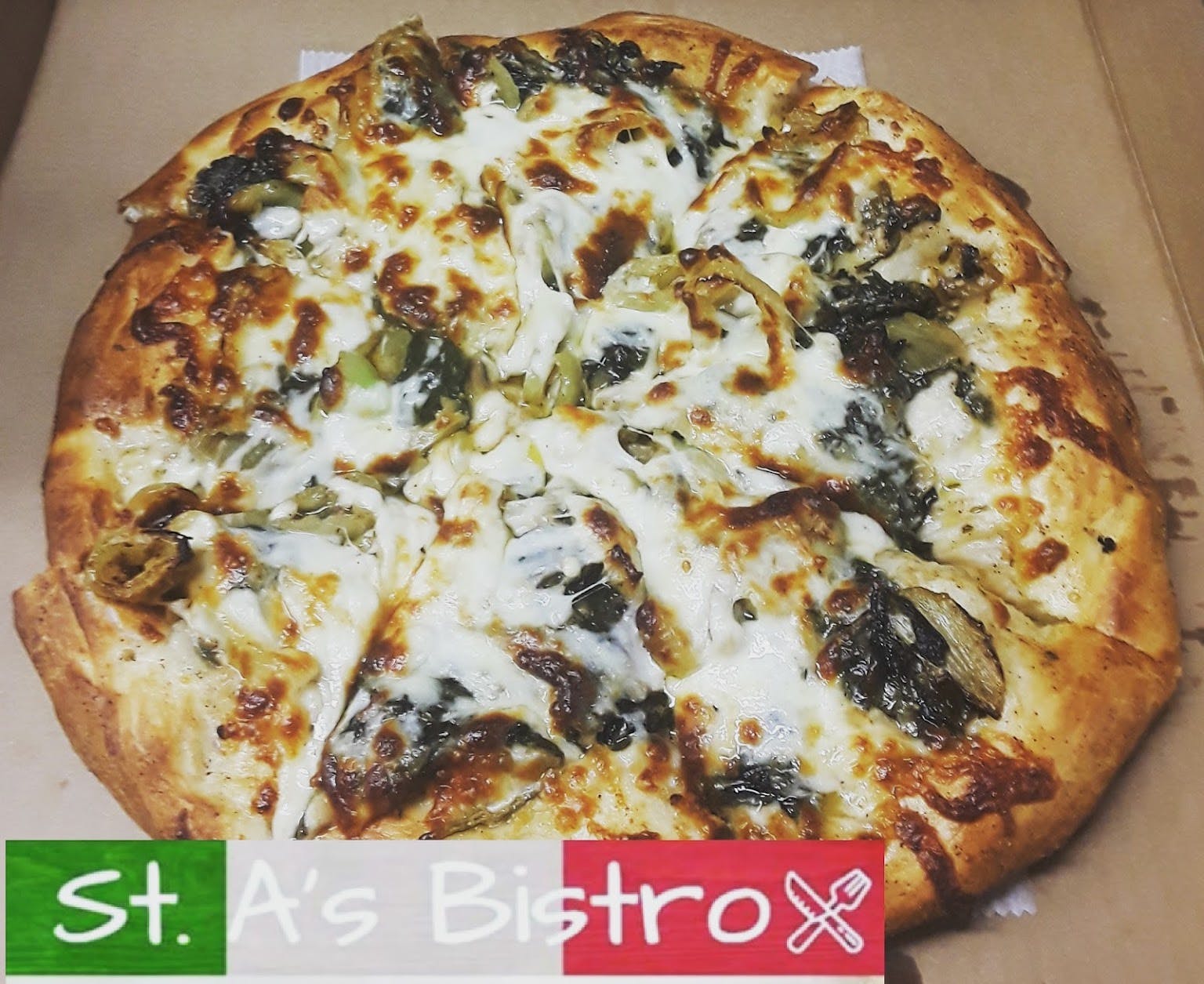 12" Pizza with crispy chicken over our St. A's hot sauce is covered with cheese.