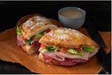 Calzone style sandwich baked with pizza dough stuffed with ham, salami, provolone, lettuce & tomatoes. Served with a side of Italian dressing. (10" Size) 550 cal.