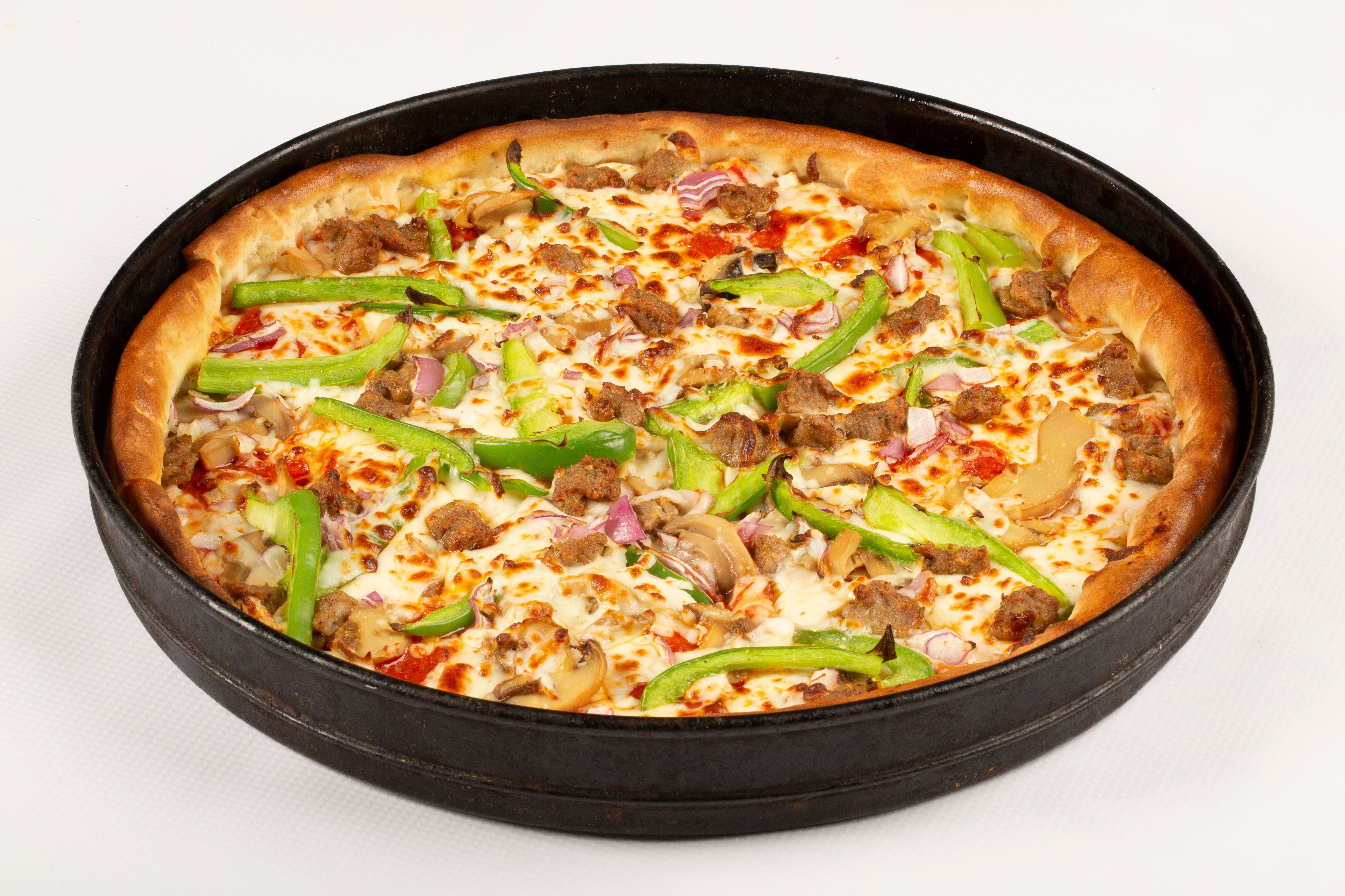Traditional sauce, pepperoni, Spanish onions, green peppers, mushrooms, Italian sausage.