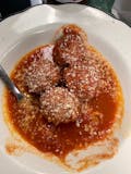 Meatballs topped with marinara sauce and baked mozzarella cheese.