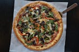 San marzano sauce, shredded mozzarella, spinach, wild mushrooms, onions, green peppers, kalamata olives.