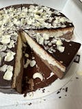 White and dark chocolate moose on a sponge base, coated with chocolate hazel nuts, glazed and topped with white chocolate shavings.