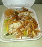 Lettuce, mild, peppers, tomatoes, red onion, olives, marinated slices chicken, breast, mozzarella & fries.