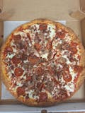 Pepperoni, sausage, onions, peppers & mushrooms.