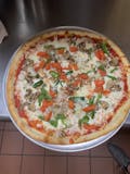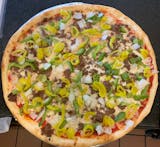 Pepperoni, sausage, onions, green peppers, mushrooms.
