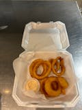 Topped with BBQ sauce, cheddar cheese & onion rings.