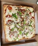Comes with roasted peppers, green peppers, mushrooms, onions, tomatoes, and mozzarella cheese